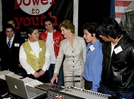 First Lady Laura Bush (center) speaks with members of the music team for Will Power to Youth's adaptation of Romeo and Juliet.